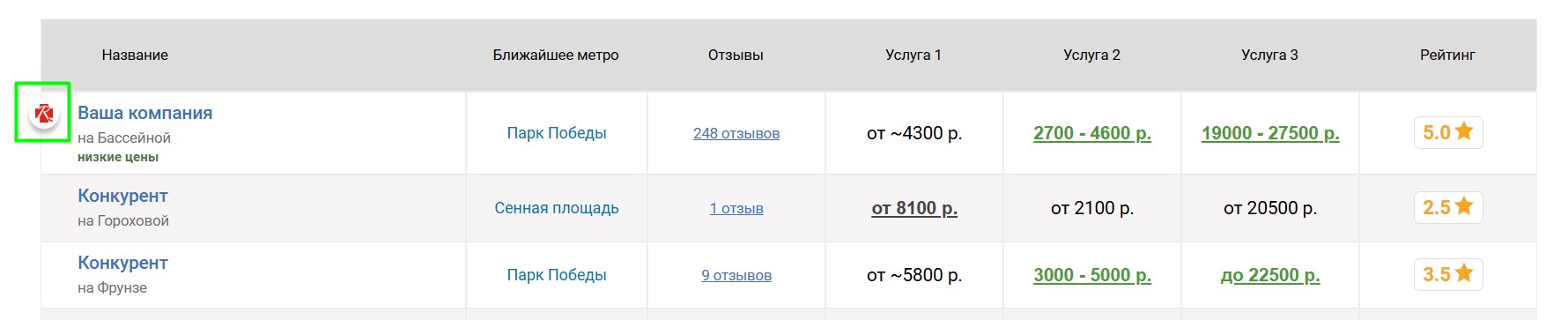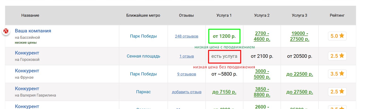 Вокруг продвигаемого таким образом салона выбирается некоторое количество ближайших конкурирующих салонов, продвигаемый салон попадёт к ним в таблицу «Сравнение по ценам», которая выглядит следующим образом: